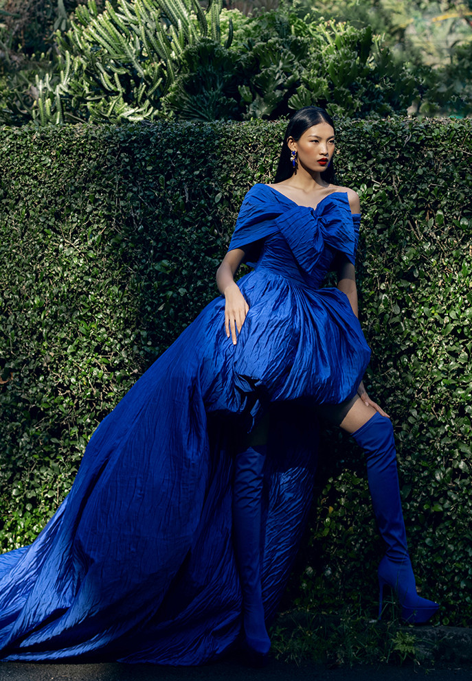 Hai nhà thiết kế trung thành với chất liệu gấm jacquard, bảng màu xanh coban rực rỡ với thiết kế công chúa nữ tính phom dáng mullet khoe trọn bờ vai gợi cảm quyến rũ. Bên cạnh đó, váy lệch vai dựng phom 3D, hay những chiếc đầm suông nữ tính giúp tôn dáng phái nữ.